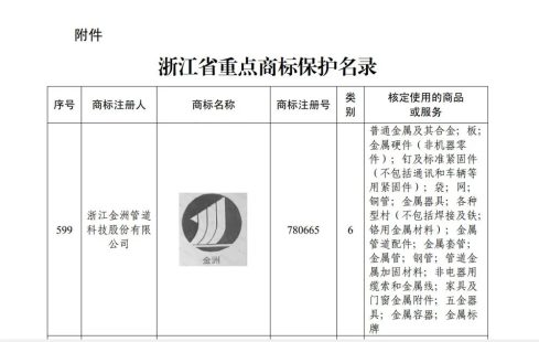 三、我会理事单位<浙江金洲管道科技股份有限公司>“金洲”商标成功入选“浙江省重点商标保护名录”
