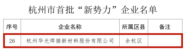 11月18日,杭州市经济和信息化局(杭州市数字经济局)公布杭州市首批“新势力”企业名单。我会副理事长单位<杭州华光焊接新材料股份有限公司>凭借卓越创新实力与行业影响力成功入选。此次入选不仅是对其在技术创新与产业升级方面引领作用的认可,更彰显了其在推动区域经济高质量发展中发挥的示范作用。