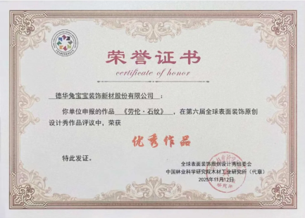 11月11日至13日,2025全球饰面大会暨第13届装饰纸与饰面板定制家居产业链创新研讨会成功召开。作为饰面领域的重要参与者,我会会员单位<德华兔宝宝装饰新材股份有限公司>携匠心之作惊艳亮相,其作品以独特的设计理念与出众的工艺呈现成功入围“第六届全球表面装饰原创设计奖”,其中“劳伦·石纹”更斩获“优秀作品”殊荣。此次获奖充分彰显了企业在饰面领域的创新实力与行业领先地位。未来,兔宝宝将持续深耕技术创新与美学探索,以更多优质原创成果服务行业发展。
