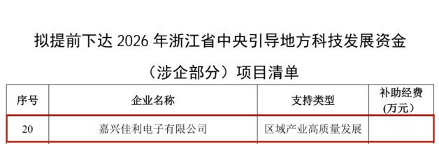 近日,浙江省科技厅对2026年浙江省中央引导地方科技发展资金(涉企部分)拟支持项目进行公示。我会理事单位<嘉兴佳利电子有限公司>成功入选,将获得专项支持。作为区域新材料产业的重要力量,嘉兴佳利始终坚持以创新驱动发展,持续加大研发投入,积极探索产学研深度融合路径,此次获批充分彰显了其在行业内的技术引领地位及对区域创新生态的建设性贡献。