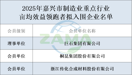 近日,嘉兴市经信局发布2025年嘉兴市制造业重点行业“亩均效益领跑者”入围企业公示名单。我会理事单位<巨石集团有限公司>会员单位<桐昆集团股份有限公司>会员单位<浙江传化合成材料股份有限公司>凭借卓越的产出效率、先进的技术能力成功上榜,荣获“市级制造业亩均效益领跑者”称号。三家企业在智能化改造、节能降耗、产业链协同等方面持续发力,已成为区域内制造业转型升级的标杆典范,将为全市构建现代化产业体系发挥示范引领作用。
