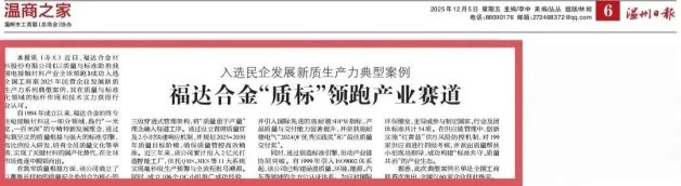 近日,我会副理事长单位<浙江福达合金材料科技有限公司>作为浙江省仅有的两家入选企业之一,成功跻身“全国工商联2025年民营企业发展新质生产力系列典型案例”名单,获得《温州日报》专题报道。据悉,该典型案例是全国工商联首次发布,全国仅60家企业获此殊荣。自1994年成立以来,福达合金始终深耕电接触材料细分领域,践行“一米宽、一百米深”的专精特新发展理念,通过筑牢质量根基、强化标准引领、加大研发投入、培育全员质量文化等关键举措,实现关键材料国产化替代,在全球市场竞争中脱颖而出,彰显了浙江新材料企业在新质生产力培育中的标杆力量。