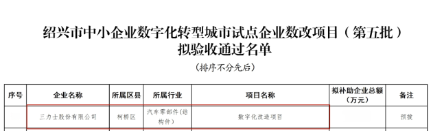 根据《绍兴市中小企业数字化转型城市试点建设实施方案》(绍市经信〔2024〕19号)及相关配套文件规定,绍兴市经信局组织开展了城市试点第五批企业数改项目验收。按照相关流程规范,经企业自评、数字化水平第三方评测和专项审计,区县审核,专家评审等程序,于近日发布绍兴市中小企业数字化转型城市试点企业数改项目(第五批)拟验收通过名单,我会理事单位<三力士股份有限公司>-“数字化改造项目”入选。
