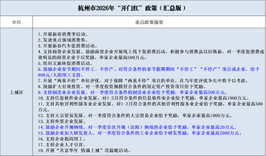 【杭企之家】奋战2026年“开门红”!杭州市发布“开门红”政策(汇总版) 微信“扫一扫”分享至朋友圈 分享: 打印本页 复制链接 相关文章 【杭州市科技局】关于公开征求《杭州市科技发展专项资金管理办法(征求意见稿)》意见的公告 【财政部】关于优化实施设备更新贷款财政贴息政策的通知 【财政部】关于实施中小微企业贷款贴息政策的通知 【浙江省发改委】关于公开征求《浙江省低(零)碳园区建设实施方案(征求意见稿)》意见的通知 【五部门】印发《关于开展零碳工厂建设工作的指导意见》的通知 【杭州市经信局】中共杭州市委关于制定杭州市国民经济和社会发展第十五个五年规划的建议 【工信部】关于印发《优质中小企业梯度培育管理办法》的通知 【湖州市经信局】关于公开征求《湖州市支持人工智能高质量发展若干措施(征求意见稿)》意见的函