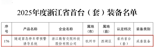 根据省委、省政府关于制造业首台(套)提升工程的有关要求和《浙江省经济和信息化厅 浙江省财政厅关于组织2025年度浙江省首台(套)装备认定工作的通知》(浙经信装备〔2025〕286号),经企业申报、地方推荐、专家评审和网上公示,浙江省经信厅于近日发布了2025年度浙江省首台(套)装备名单,我会会员单位<浙江数智交院科技股份有限公司>-“隧道紧急停车带预警诱导系统”入选。
