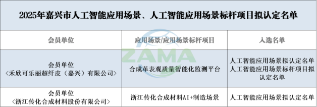 根据《嘉兴市推进“人工智能”行动计划 (2025—2027年)》和《嘉兴市人工智能应用场景、人工智能应用标杆企业、“数智优品”、高质量数据集认定管理办法(试行)》,经企事业单位申报、县(市、区)部门推荐、专家评审、现场答辩等程序,嘉兴市经信局于近日发布2025年嘉兴市人工智能应用场景和人工智能应用场景标杆项目拟认定名单,我会会员单位<禾欣可乐丽超纤皮(嘉兴)有限公司><浙江传化合成材料股份有限公司>相关应用场景成功入选。