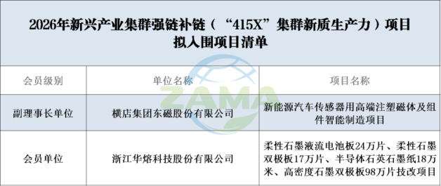 根据《浙江省经济和信息化厅 浙江省财政厅关于组织开展2026年度浙江省新兴产业强链补链(“415X”集群新质生产力)项目计划的通知》(浙经信产业〔2025〕328号)有关要求,经企业自愿申报、地方审核推荐、省经信厅初审和专家评审等相关程序,浙江省经信厅于近日发布2026年新兴产业集群强链补链(“415X”集群新质生产力)项目拟入围项目清单,我会两家会员单位项目入选。