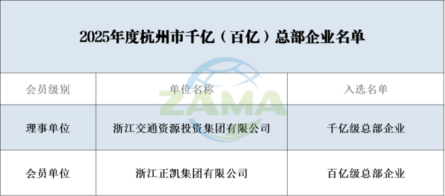 根据《杭州市人民政府办公厅关于进一步推动杭州总部经济高质量发展的实施意见》(杭政办〔2024〕1号)文件精神,为进一步扶持、培育和引进总部企业,我市组织开展2025年度总部企业认定。经企业自主申报、属地和市级部门审核,杭州市人民政府于近日发布2025年度杭州市千亿(百亿)总部企业名单。我会理事单位<浙江交通资源投资集团有限公司>、会员单位<浙江正凯集团有限公司>荣誉入选。