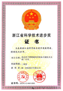 2月,浙江省科技厅发布了2024年度浙江省科学技术奖获奖名单,我会会员单位<钢一控股集团有限公司>凭借“高品质不锈钢超纯净制备关键技术及推广应用”项目,荣获浙江省科技进步二等奖。近日,企业正式获颁荣誉证书,证书编号:2024-J-2-045-D01。此项荣誉不仅是对公司科研实力与技术创新成果的充分肯定,更标志着其长期聚焦不锈钢领域、坚持创新驱动发展道路的重要里程碑,彰显了在行业中的核心竞争力和引领作用。