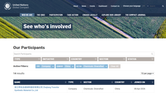 近日,我会会员单位<浙江传化合成材料股份有限公司>获准加入联合国全球契约组织(UNGC),标志着传化合成在全球化合规治理、社会责任与可持续发展领域,迈出了与国际标准同频的重要步伐。